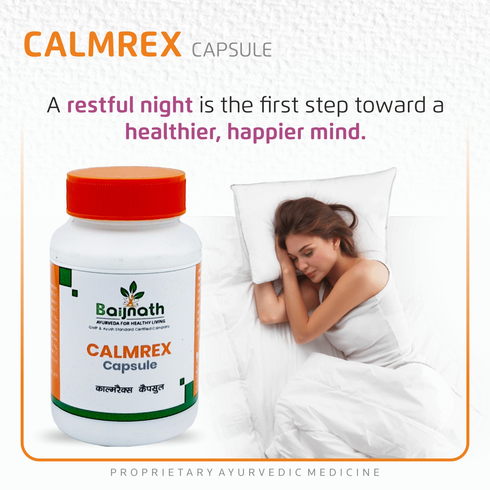 Calmrex Capsule is an Ayurvedic herbal formulation traditionally used to support relaxation and healthy sleep patterns. It contains herbs such as Jatamansi, Brahmi, Shankhpushpi, Sarpagandha, Punarnava, Arjuna, and Ajwain. Jatamansi is traditionally valued for its calming properties, while Brahmi and Shankhpushpi are used to promote mental clarity and a relaxed state of mind. Sarpagandha has a long history of use in supporting a calm physiological response. Ajwain is commonly used to support digestion, which can contribute to better nighttime comfort. Calmrex Capsule is formulated to support natural relaxation and restful sleep as part of a balanced lifestyle and wellness routine.